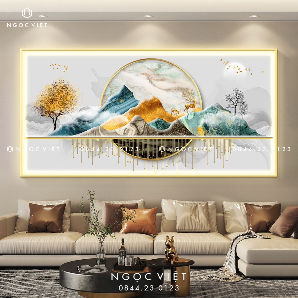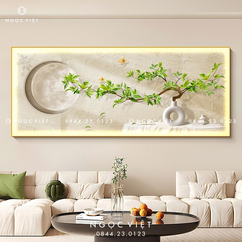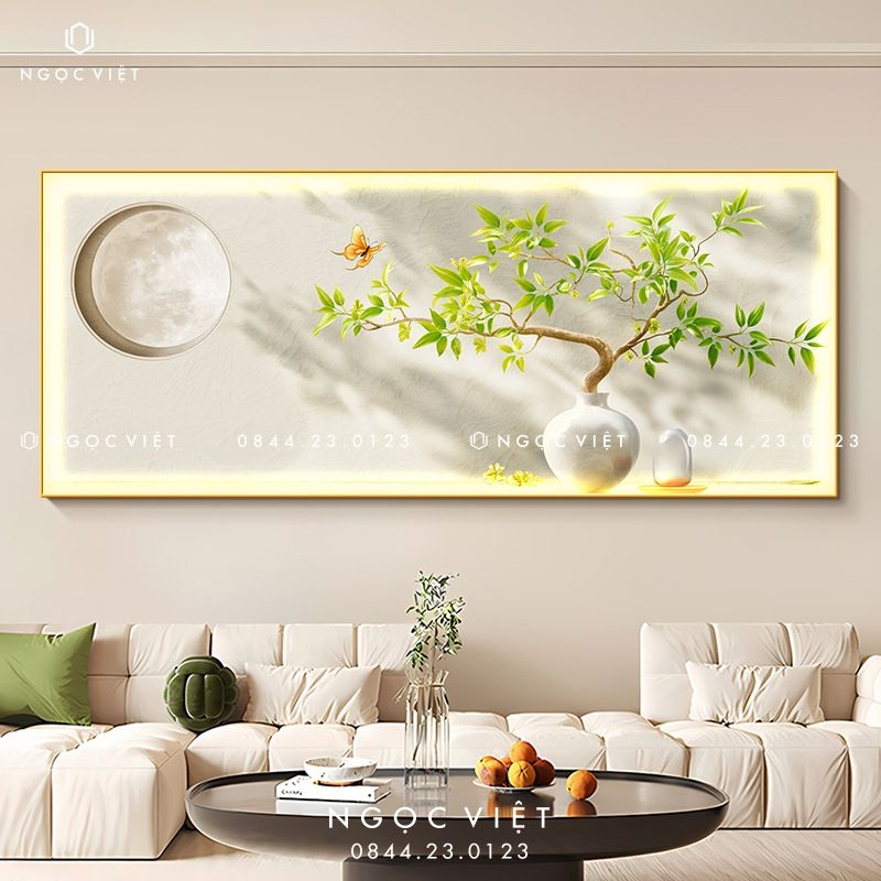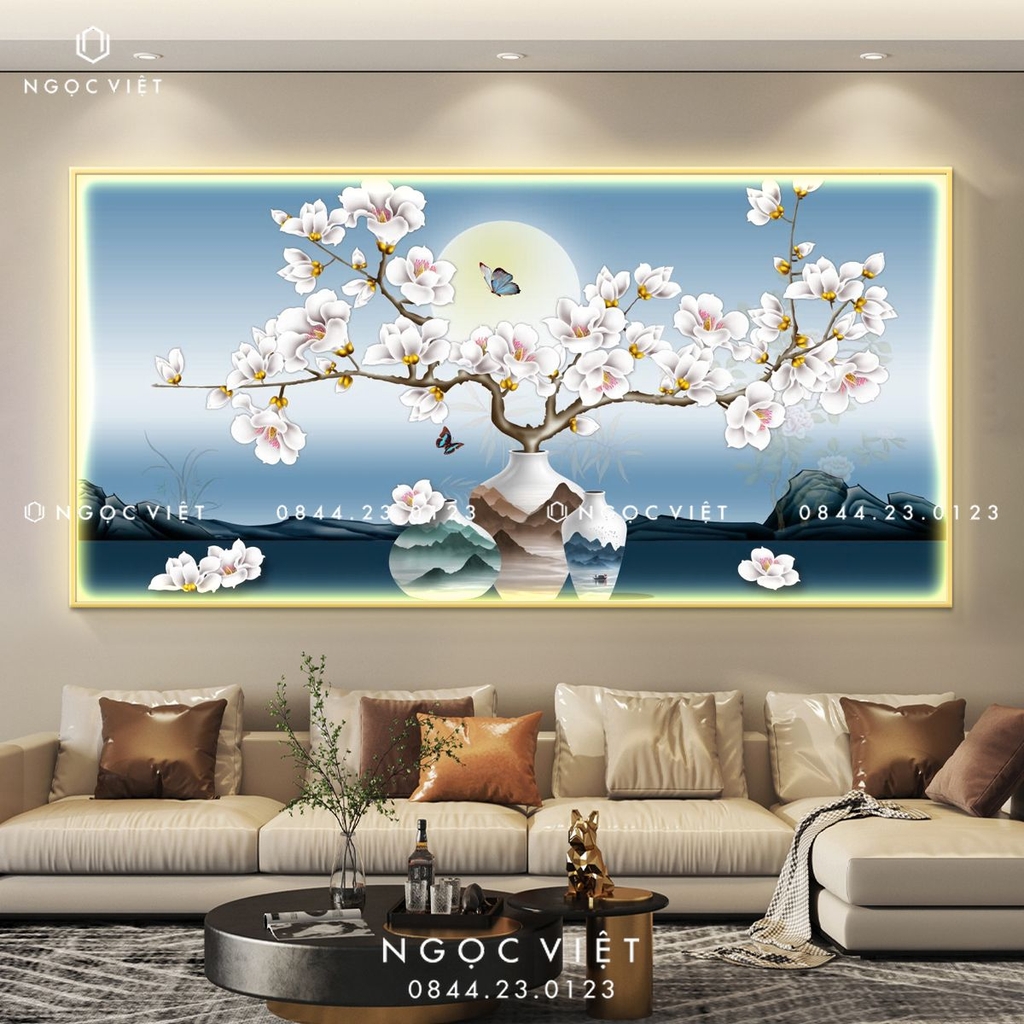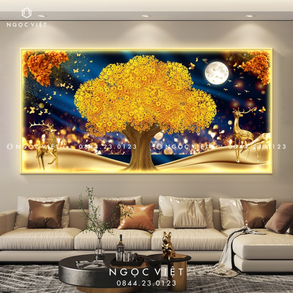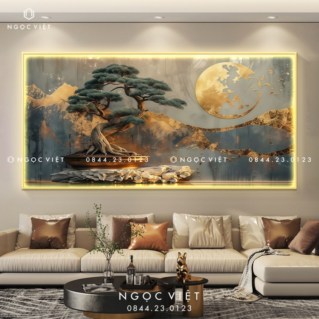 - Tranh có dải đèn LED phát sáng lung linh màu vàng ấm, giúp bừng sáng không gian nội thất khi treo.