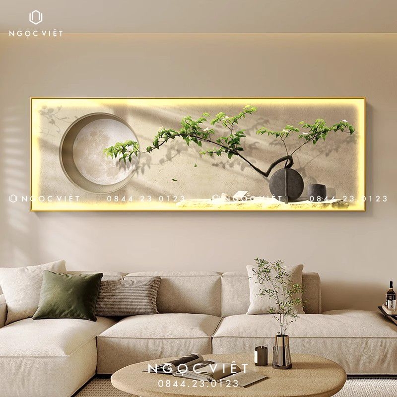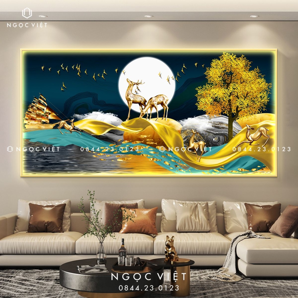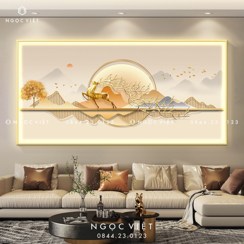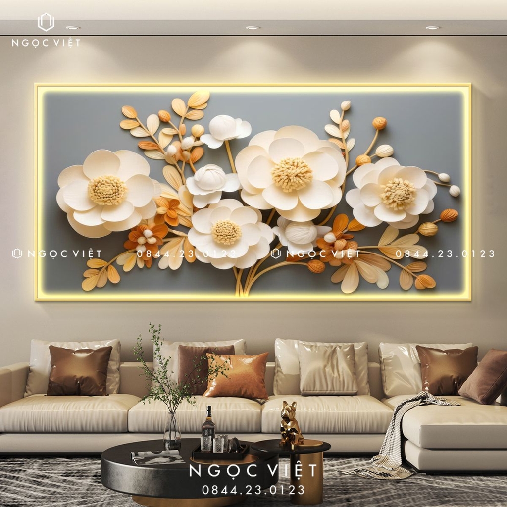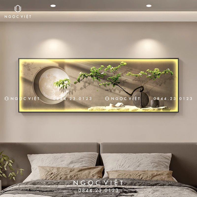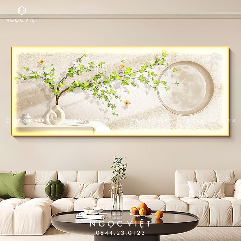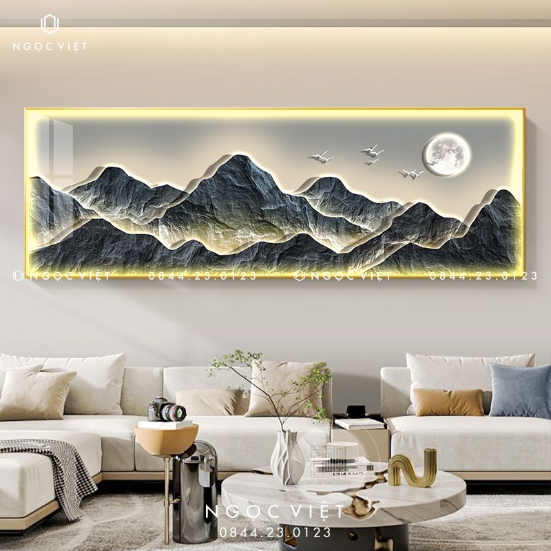 - Tranh có dải đèn LED phát sáng lung linh màu vàng ấm, giúp bừng sáng không gian nội thất khi treo.